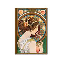 Exkluzívny denný diár s motívom Alfonza Muchu. Diár je v pevnej väzbe s prednou penou, soft touch laminom a červenou, modrou, zlatou razbou. Slovenské kalendárium.