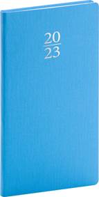 Kapesní diář Capys 2023 ve světle modré barvě. Povrch imitující jemnou strukturu plátna je vhodný pro ražbu přes fólii. Atraktivní barevný odstín doplňuje ražba letopočtu. Týdenní rozvrh s česko-slovenským kalendáriem a doplňkovou angličtinou, němčinou, maďarštinou a ruštinou. • kalendárium od prosince 2022<br/>