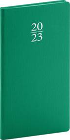 Kapesní diář Capys 2023 v zelené barvě. Povrch imitující jemnou strukturu plátna je vhodný pro ražbu přes fólii. Atraktivní barevný odstín doplňuje ražba letopočtu. Týdenní rozvrh s česko-slovenským kalendáriem a doplňkovou angličtinou, němčinou, maďarštinou a ruštinou. <br><br>• kalendárium od prosince 2022<br/>