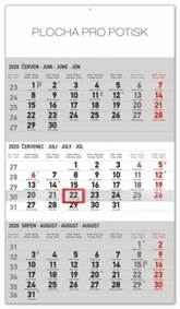 Přehledný tříměsíční kalendář s českými jmény a šedým tónováním. 4jazyčné (CZ, DE, GB, SK) / 12 listů